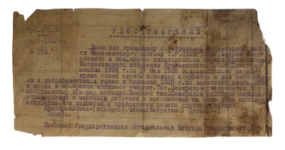 Удостоверение выдано А. А. Семерикову и подтверждает его службу приказчиком Батраковского отделения Кузкеевского П. О. Мензелинского кантона. Также в заявлении перечислены его заслуги на службе, и то, что он увольняется по-собственному желанию.