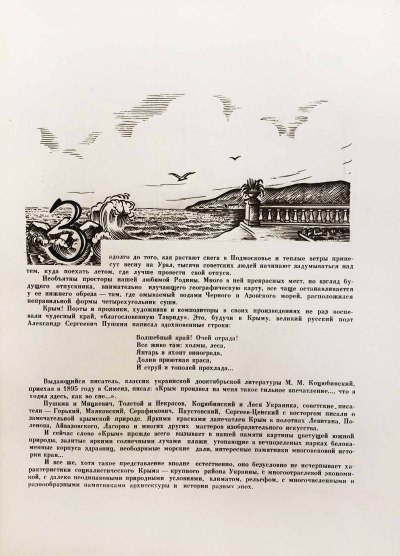 Прекрасно иллюстрированная книга. На страницах издания можно увидеть картины цветущей южной природы, залитые яркими солнечными лучами пляжи, утопающие в вечнозеленых парках белокаменные корпуса здравниц, необозримые морские дали, интересные памятники многовековой истории края. Поэты и прозаики, художники и композиторы в своих произведениях не раз воспевали чудесный край, «благословенную Тавриду». Выдающийся писатель, классик украинской дооктябрьской литературы М. М. Коцюбинский, приехав в 1895 году в Симеиз, писал: «Крым произвел на меня такое сильное впечатление… что я ходил здесь, как во сне…».