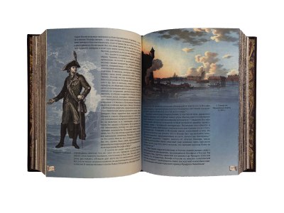 Книга в цельнокожаном переплете ручной работы с тиснением золотом и иллюстрацией на передней переплетной крышке. Серебряные обрезы.
