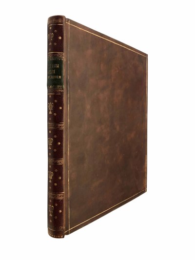 Книга в цельнокожаном переплете эпохи с золотым тиснением по корешку.