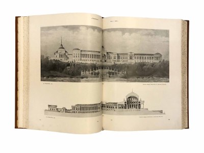 Книга в цельнокожаном переплете ручной работы с тиснением золотом и инкрустацией кожей. Обложки сохранены в переплете.