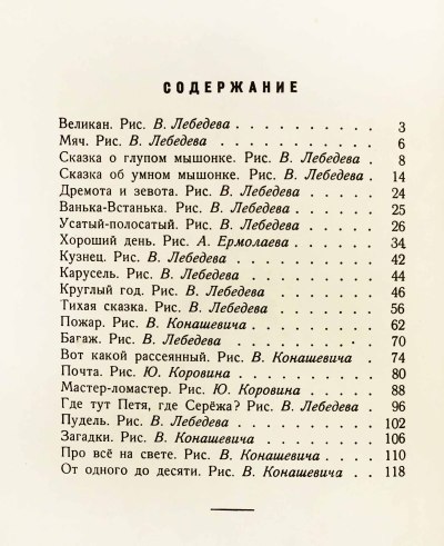 В сборник детских стихов С.Маршака вошли знаменитые "Великан", "Мяч", "Сказка о глупом мышонке", "Сказка об умном мышонке", "Дремота и Зевота", "Ванька-Встанька", "Усатый полосатый", "Хороший день", "Кузнец", "Вот какой рассеянный" и многие другие.