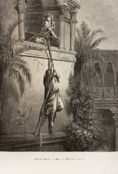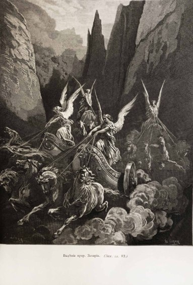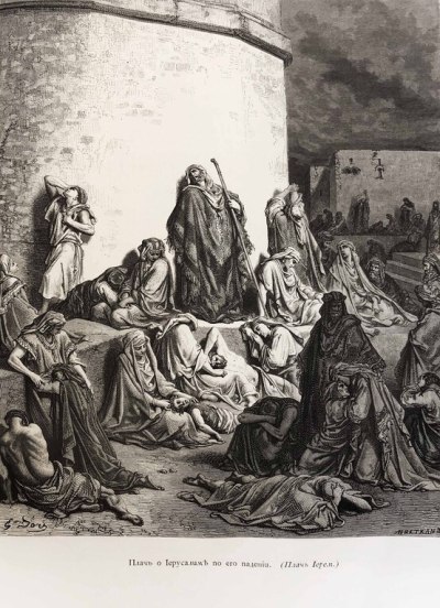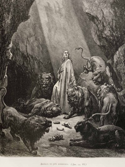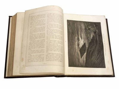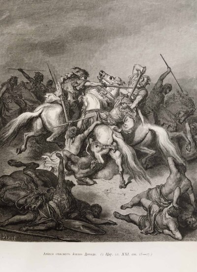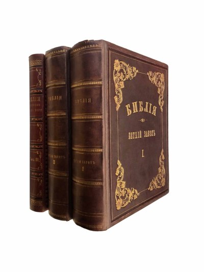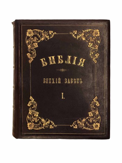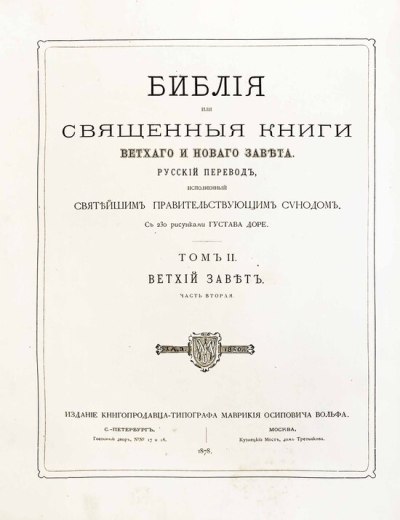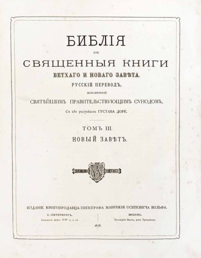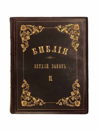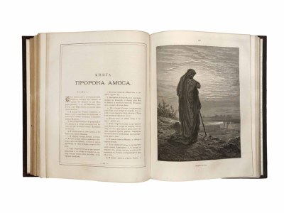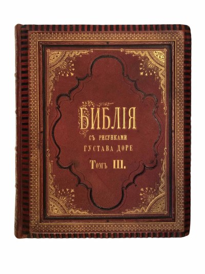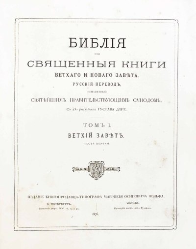 Первый полный перевод Библии на современный русский язык. С иллюстрациями знаменитого французского рисовальщика Кристофа Поля Густава Доре (1832-1883). Иллюстрации к Библии, выполненные в духе романтизма, занимают особое место в творчестве мастера. 230 гравюр Доре закончил в 1865 г.; тогда же они были опубликованы во Франции. С 1866 по 1870 гг. иллюстрированная Библия начала выходить частями одновременно в Лондоне и Нью-Йорке. А в 1876-1878 гг. появилась и в России. При ее издании был использован выполненный незадолго до этого Синодальный перевод — первый полный перевод всех книг Библии на современный русский язык.
