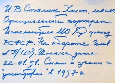 Официальный портрет. Исполнитель: МО Худ. фонд РСФСР. На обороте Инв. № П/1203. Штамп, дата 22.01.51. Снят с учета и "уничтожен" в 1957 г.