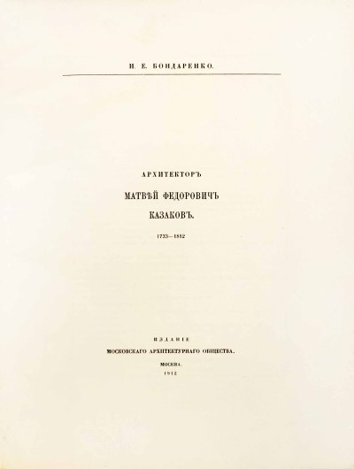 Издание Московского Архитектурного Общества посвящено деятельности великого русского зодчего Матвея Казакова (1733-1812). Он был родоначальником московской архитектурной школы, один из основоположников классицизма в русской архитектуре.
