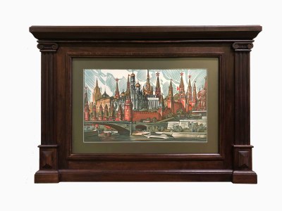 На яркой ксилографии изображены главные достопримечательности Москвы: набережная Москва-реки, Кремль, Храм Василия Блаженного, Кремлёвский дворец съездов, и Сталинские высотки.