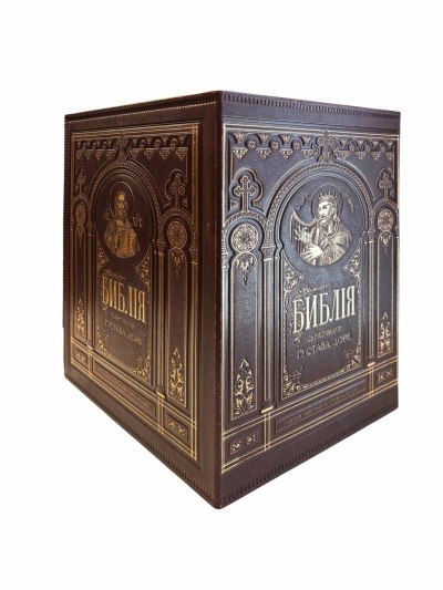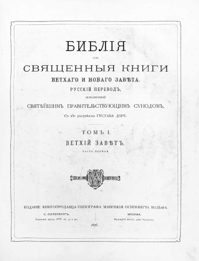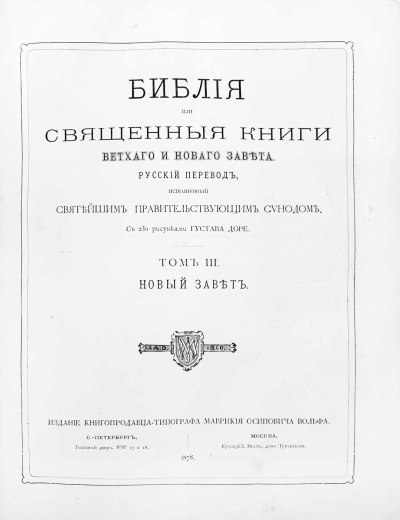 Лучшее издание «Ветхого и Нового Завета» выполненное в России в XIX веке! Библия была издана в ограниченном количестве экземпляров и практически сразу же была раскуплена. Она стала библиографической редкостью, тем более, что клише после изготовления гравюр были уничтожены.