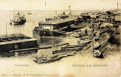 Примеры открыток: Вид на Волгу, Баржи на Волге, Набережная, Пассажирский пароход и многие другие открытки с видами города и реки.