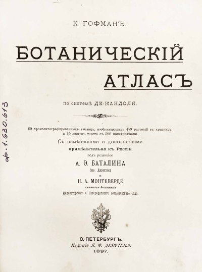 Спб.: Издание Давриена. 1897 год. Издание под редакцией А.Ф.Баталина, бывшего директора и Н.А.Монтеверде, главного ботаника Императорского С.-Петербургского Ботанического Сада.
