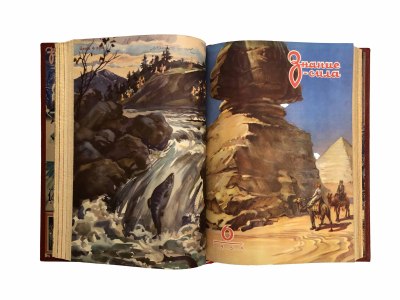 В цельнокожаном переплете ручной работы с тиснением золотом и иллюстрацией на передней переплетной крышке. Иллюстрированные форзацы. Золотые обрезы. Цветные иллюстрированные обложки сохранены в переплете.