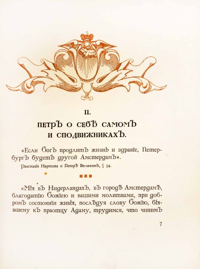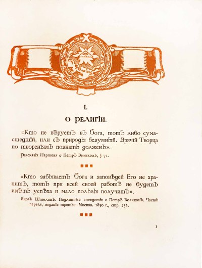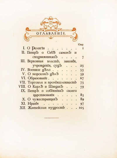 Книга была выпущена в честь двухсотлетия Полтавской битвы. Авторы старались представить великого преобразователя во всем блеске мудрости. Высказывания Государя распределены по темам: О религии. Петр о себе самом и сподвижниках. Верховная власть, законы, учреждения, суд. Военное дело. О морском деле. Образование. Торговля и промышленность. О Карле и шведах. Петр о событиях своего царствования. О чужестранцах. Нравы. Житейская мудрость.