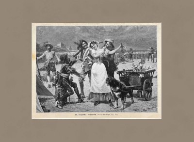 Гравюра сделана по картине художника Маттегацца. Картина художника изображает веселую сценку из военного быта средневековых времен. Храбрые воины, которым все никак не удастся взять соседнюю крепость, начинают атаковать хорошенькую девушку, торговку вином. Бедная продавщица совершает свой обход с необычайными затруднениями и вынуждена отбиваться от слишком усердных поклонников.