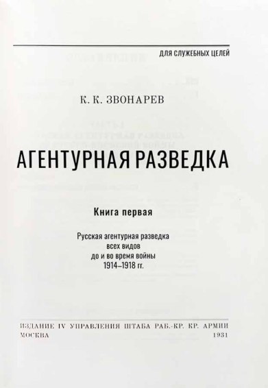 Результатом реализации столь глобального замысла стали подготовленные К. К. Звонаревым (настоящая фамилия Зайгзне К. К.) два тома капитального исследования: том I — об агентурной разведке царской России и том II — об агентурной разведке Германии, которые вышли из печати в 1929-31 гг. Под грифом "Для служебных целей".