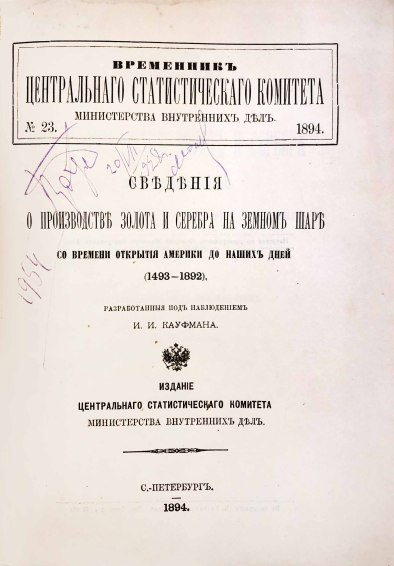 Сведения о производстве золота и серебра на земном шаре, разработанные под наблюдением И. И Кауфмана.