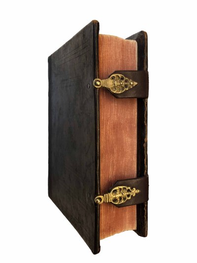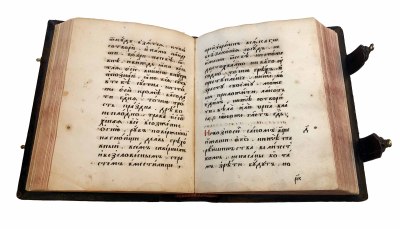 В цельнокожаном переплете эпохи с новодельными элементами. Имеются две застежки. Текст рукописный, имеются инициалы, заставки, концовки, орнаментальные украшения.
