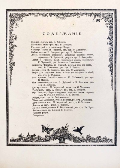 В сборник входят различные сказки в пересказе К. Чуковского, рассказы М. Горького, стихи Н. Вергрова, М. Моравской и С. Черного. Над иллюстрациями к сборнику работали А. Бенуа, Ю. Анненков, Б. Попова, М. Добужинский, И. Пуни, А. Радаков и др.