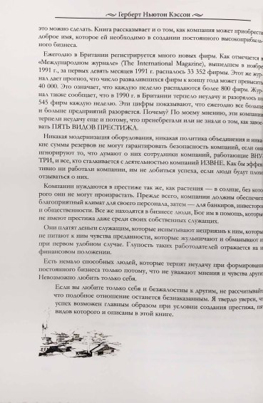 Успешный британский предприниматель Герберт Ньютон Кэссон (Herbert Newton Casson) жил в первой половине 20 столетия. Руководил крупными предприятиями, консультировал другие компании и издавал книги, на которых учились будущие поколения менеджеров и собственников бизнеса. Герберт Кэссон учил взвешенному ведению финансовых дел и показывал истинные причины провалов в бизнесе. Ядром его бизнес-философии стали принципы мышления успешного предпринимателя, которые работают независимо от времени, географии и самих людей. Ещё Герберта Кэссона часто называют «Дейлом Карнеги для деловых людей». Его «советы» и «правила» — это азбука современного бизнесмена. То, о чем писал Герберт Кэссон в далеком 1923 году, актуально и сейчас: в психологии людей и бизнеса мало что изменилось, иначе бы предприниматели всех времен и народов не совершали одни и те же ошибки.
