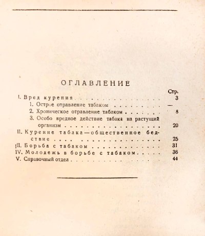 Главы книги: Вред курения. Острое отравление табаком. Хроническое отравление табаком. Особо вредное действие табака на растущий организм. Курение табака — общественное бездействие. Борьба с табаком. Молодежь в борьбе с табаком.