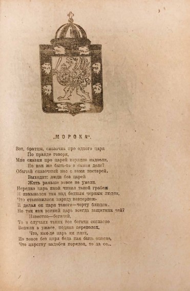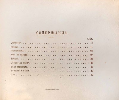 В настоящее издание вошли стихи "Морока", "Крысы", "Чертовщина", "Усы да борода", "Звонок", "Пирог да блины", "Волк-правитель", "Воробей и мышь", "Суд". Острая сатира направлена на духовенство, помещиков и дворян и призвана растолковать, кто именно является истинным виновником всех бед простого народа.
