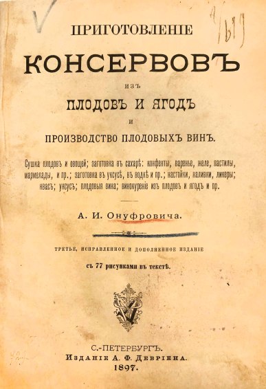 Подзаголовок: «Сушка плодов и овощей; заготовка в сахаре: конфекты, варенье, желе, пастилы, мармелады и пр.; заготовка в уксусе, в водке и пр.; настойки, наливки, ликеры; квас; уксус; плодовые вина; винокурение из плодов и ягод и пр.»