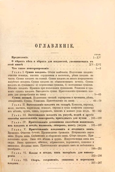 Главы в книге: Сушка плодов, Заготовление плодов в сахаре, Заготовление плодов в уксусе, водке и другие способы изготовления консервов, пригодных для кухни, Приготовление плодовых и ягодных вин, Приготовление сахара-патоки из арбузов с целью заменить свекольный сахар при приготовлении плодовых вин, Сбор, сохранение, упаковка и пересылка плодов.
