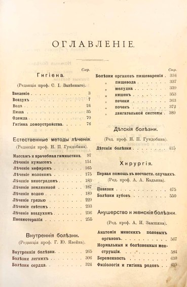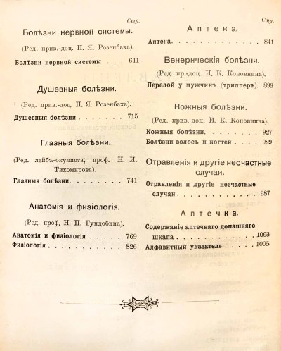 Разделы книги: Гигиена. Естественные методы лечения. Внутренние болезни. Детские болезни. Хирургия. Первая помощь в несчастных случаях. Акушерство и женские болезни. Болезни нервной системы. Душевные болезни. Глазные болезни. Анатомия и физиология человеческого тела. Венерические болезни. Кожные болезни.