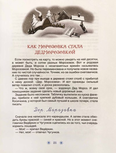 Придумал эту деревню замечательный детский писатель Андрей Усачев, великолепный детский художник-иллюстратор Виктор Чижиков нарисовал жителей Дедморозовки, а талантливые художники Е. Здорнова и В. Минеев помогли создать рисунки к книге.