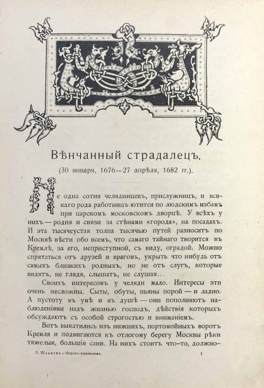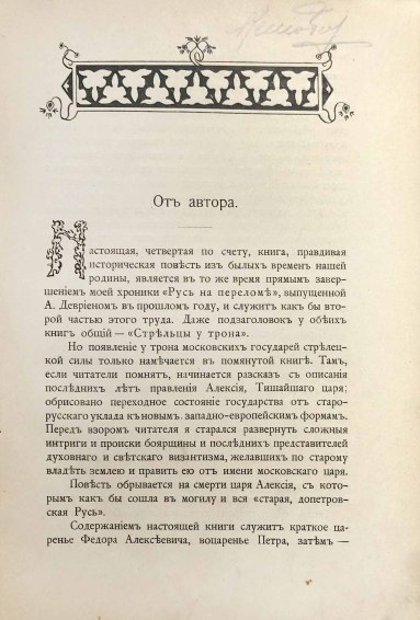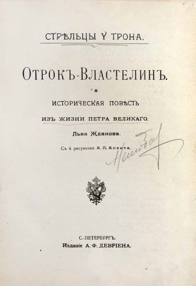 Лев Григорьевич Жданов (псевд. Льва Григорьевича Гельмана, 1864-1951) — русский писатель и драматург. Повесть представляет собой описание царствования Федора Алексеевича, попытки Софьи-царевны взять власть в свои руки, в нем дается оценка личности Петра Великого и первых лет его правления.