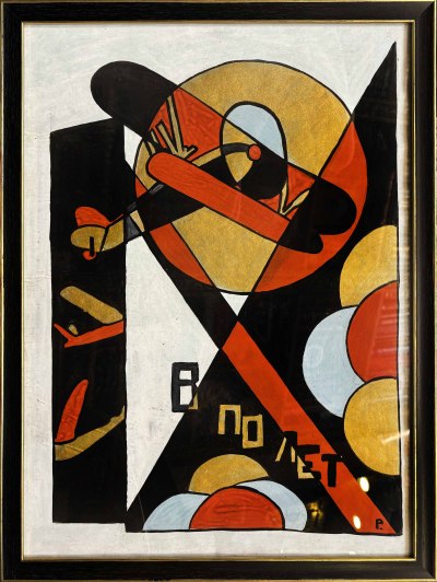 Этот рукописный плакат выполнен в стиле конструктивизма, характерном для авангардного искусства первых десятилетий XX века. Яркие цвета и динамичные линии передают дух стремления к новым высотам и прогрессу, что было типично для той эпохи.