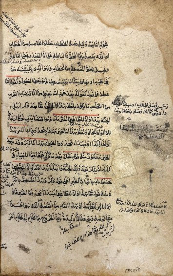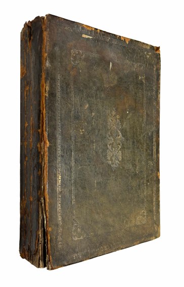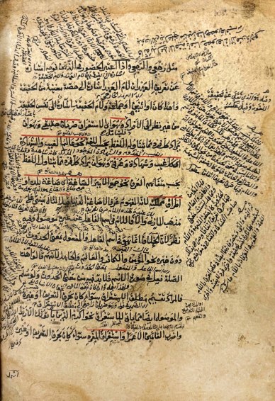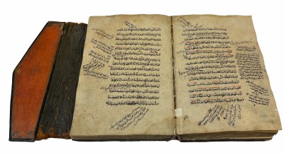 Восточная рукопись в старинном кожаном переплете. На арабском языке. Переплет профессиональной работы (посл. четв. XIX в.) с фигурным клапаном, с декоративным тиснением под золото и трехцветным форзацем. Слегка обветшал, потерт и надорван на сгибах, удовлетворительной сохранности. Общая сохранность списка удовлетворительная: умеренное загрязнение, темные подтеки от сырости, незначительные надрывы и мелкие отверстия, прогрызенные шашелем. На полях встречаются многочисленные вставки, сделанные переписчиком основного текста, и приписки позднейших читателей рукописи.