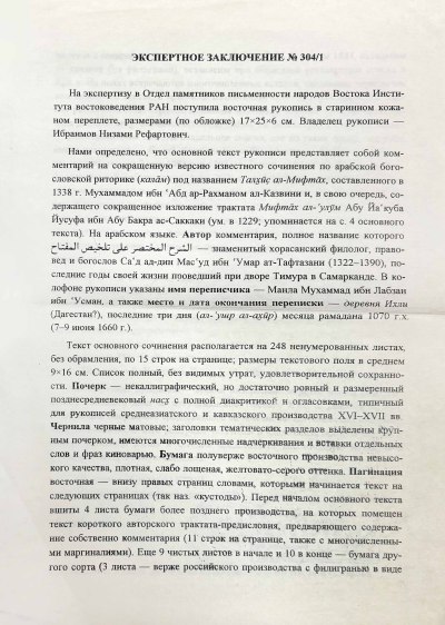 Получена экспертиза в Отделе памятников письменности народов Востока Института востоковедения РАН. Основной текст рукописи представляет собой комментарий на сокращенную версию известного сочинения по арабской богословской риторике (калӑм) под названием Талхиҫ ал-Мифтӑх, составленного в 1338 году Мухаммадом ибн ʿАбд ар-Рахманом ал-Казвини. Также содержит сокращенное изложение трактата Мифтӑх ал-ʿулӯм Абу Йаʿкуба Йусуфа ибн Абу Бакра ас-Саккаки. Автор комментария — знаменитый хорасанский филолог, правовед и богослов Саʿд ад-дин Масʿуд ибн ʿУмар ат-Тафтазани (1322-1390), последние годы своей жизни проведший при дворе Тимура в Самарканде. Имя переписчика — Манла Мухаммад ибн Лабзан ибн ʿУсман.