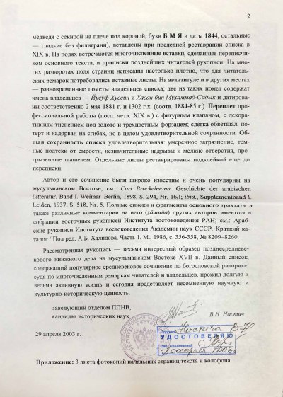Эта рукопись — весьма интересный образец поздне средневекового книжного дела на мусульманском Востоке XVII в. Данный список, содержащий популярное средневековое сочинение по богословской риторике, судя по многочисленным ремаркам читателей и владельцев, прожил долгую, но весьма активную жизнь и сегодня представляет несомненную научную и культурно-историческую ценность.
