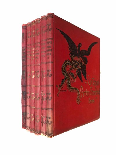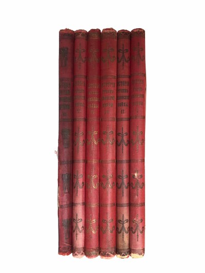 Книги в переплетах эпохи с золотым тиснением по передним переплетным крышкам и корешкам. Потертости. На титульных листах штампы.