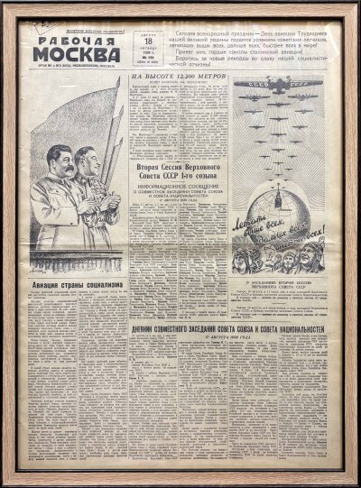 Первая страница газеты "Рабочая Москва" за 1938 год посвящена одному из главных праздников Советского Союза — Дню авиации. Этот выпуск является уникальным историческим документом, отражающим эпоху бурного развития советской авиации и героизации летчиков.