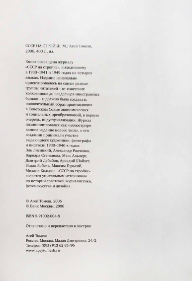 Книга посвящена журналу «СССР на стройке», выходившему в 1930-1941 и 1949 годах на четырех языках. Издание изначально ориентировалось на самые разные группы читателей — от советских колхозников до владельцев иностранных банков — и должно было создавать положительный образ происходящих в Советском Союзе экономических и социальных преобразований, в первую очередь, индустриализации. Журнал позиционировался как «иллюстрированное издание нового типа», в его создании принимали участие выдающиеся художники, фотографы и писатели 1930-1940-х годов: Эль Лисицкий, Александр Родченко, Варвара Степанова, Макс Альперт, Дмитрий Дебабов, Аркадий Шайхет, Исаак Бабель, Максим Горький, Михаил Кольцов. «СССР на стройке» является уникальным источником по истории советской журналистики, фотоискусства и дизайна.