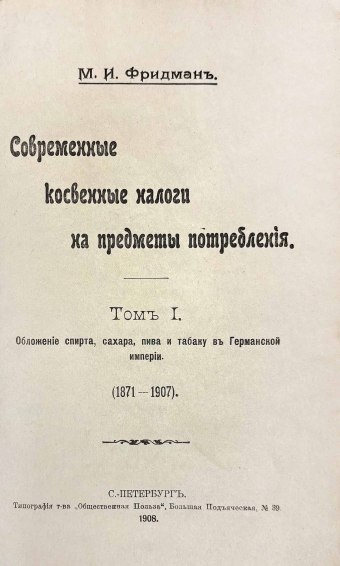 Первый том — единственный вышедший в этом издании. Михаил Исидорович Фридман (1875-1921) — российский экономист и государственный деятель, специалист в области науки о финансах, представитель социологического направления. В марте 1903 — сентябре 1904 был командирован Санкт-Петербургским политехническим институтом в Германию для подготовки диссертации о германском косвенном налоговом обложении. Результаты исследований опубликованы в настоящей книге.