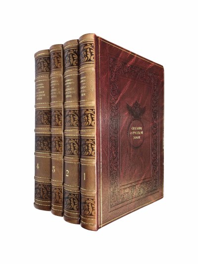 В переплетах с золотым тиснением корешка и тиснением переплетной крышки. Узорные форзацы. Раскладные листы.