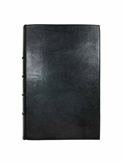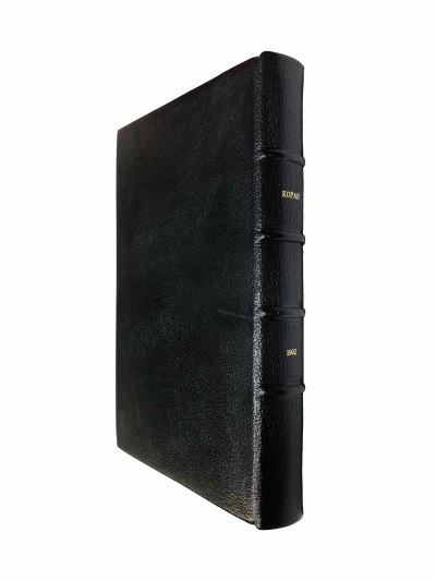 В кожаном переплете с золотым тиснением. Некоторые страницы Корана оформлены изящным орнаментом.