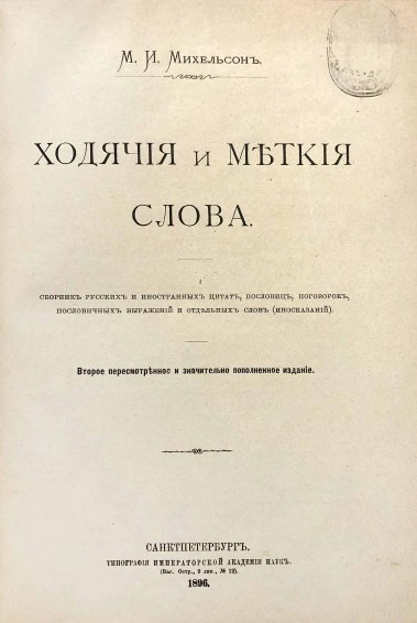 Одна из самых известных книг выдающегося филолога, фольклориста, педагога и писателя, около 20 лет занимавшегося изучением русской фразеологии, Морица Ильича Михельсона (1825–1908). Сборник образных слов и иносказаний был удостоен Императорской Академией наук премии Митрополита Макария. Книга содержит устойчивые фразеологизмы, иносказания, пословицы, поговорки, цитаты, иностранные слова, вошедшие в русский язык. Весь материал приведен в алфавитном порядке с непременным указанием многообразия значений и всевозможных способов применения, проиллюстрированных примерами из литературы и фольклора.