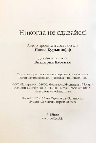 Подарочное издание «Никогда не сдавайся!» в кожаном переплете — это книга напутствие руководителю о мудрости жизни в афоризмах, изречениях, поэтических строфах, правилах и наставлениях, авторами которых являются известные люди: Ингвар Кампрад, Адам Смит, Павел Нахимов, Луи Пастер, Соичиро Хонда, Генри Форд, Дмитрий Менделеев, Дейл Карнеги, Арманд Хаммер, Николай Вавилов, Джузеппе Феррари, Билл Гейтс, Малколм Форбс, Сергей Королев, Джон Рокфеллер, Коносуке Мацусита, Курт Карлсон и многие, многие другие. На второй странице книги имеется место для приветствия или поздравления.