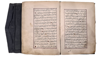 Тканевый переплет. Некоторые страницы Корана оформлены изящным орнаментом, выполненным жидким золотом и краской. Заломы и разрывы на страницах и потертости переплета.