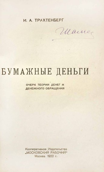 Книга в первый раз была издана в 1918 г. в Харькове. Она представляла собою переработку части курса «Деньги, денежное обращение, кредит и банки», прочитанного И.А.Трахтенбергом в Харьковском коммерческом институте в 1914-1917 г.г. В 1922 г. книга была переиздана в Москве.