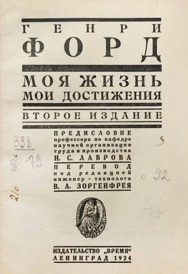 Л.: Изд-во «Время». 1924 г. Предисловие профессора по кафедре научной организации труда и производства Николая Сергеевича Лаврова. Перевод под редакцией инженер-технолога Владимира Александровича Зоргенфрея.