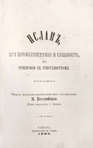 Опыт историко-апологетического исследования Н. Боголюбского. Боголюбский Николай Иванович (1856-1926) — русский богослов, проповедник, один из руководителей обновленчества. После защиты в Московской духовной академии диссертации «Ислам, его происхождение и сущность по сравнению с христианством» (1885) был утверждён в степени магистра богословия (1887).