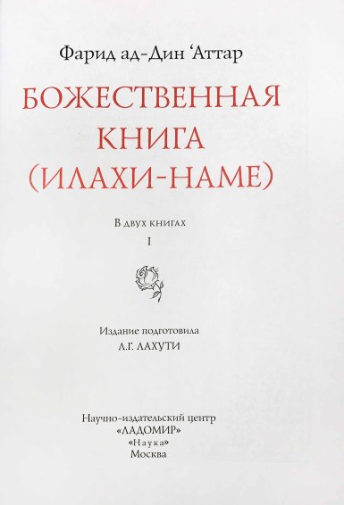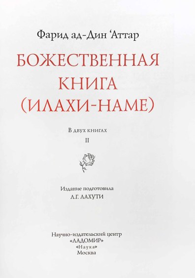 «Божественная книга» («Илахи-наме»), впервые публикуемая на русском языке, — несомненный шедевр, подлинная жемчужина в сокровищнице мировой литературы. Ее автор — персидский поэт-мистик, рассказчик и философ XII XIII веков Фарид ад-Дин по прозванию Аттар («аптекарь», «парфюмер»). Он составлял целебные благовония и лечил ими людей, а благоухание его стихов, как говорили другие поэты, пронизало всю последующую персидскую поэзию. Его творчество оказало мощное и продолжительное влияние на развитие литературы в Иране и далеко за его пределами. Так, знаменитый Джалал ад-Дин Руми, поэт XIII века, называл Аттара своим вдохновителем, а себя — его «прислужником в искусстве слова».