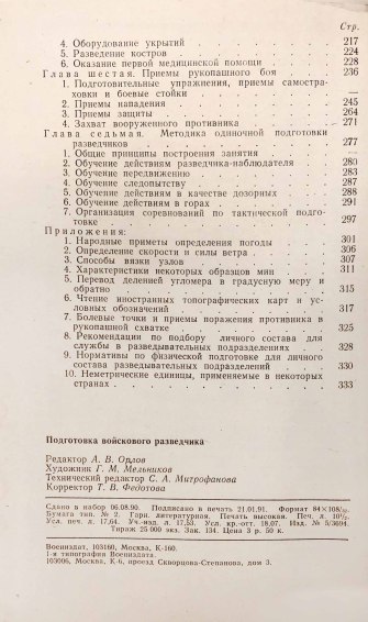 В учебном пособии всесторонне рассматриваются приемы и способы подготовки войскового разведчика. Доходчиво и наглядно показаны техника скрытного и бесшумного передвижения, способы ведения разведки различных объектов, приемы и способы ориентирования, приемы рукопашного боя. Даются рекомендации по обеспечению и сохранению боеспособности личного состава в разведке.