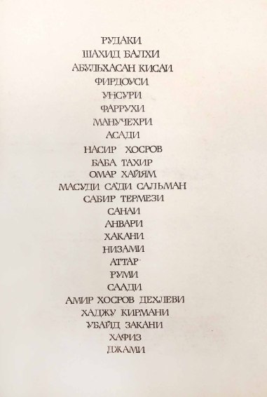 В книгу вошли стихотворения и отрывки из поэм персидских и таджикских поэтов классического периода: Рудаки, Фирдоуси, Омара Хайяма, Саади, Хафиза, Джами и других, азербайджанских поэтов Хакани н Низами (писавших на фарси), а также персоязычного поэта Индии Амира Хосрова Дехлеви.