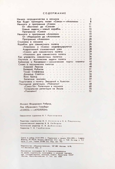 О подготовке этого полета рассказывает книга «Союз» — «Аполлон». Читатель узнает, как устроены космические корабли «Союз» и «Аполлон», какие наиболее важные полеты на них совершались, как они модернизированы специально для совместного полета. Интересен рассказ о космодромах: советском Байконуре и американском — на мысе Канаверал, о многочисленных совместных тренировках советских и американских космонавтов в Звездном городке и Хьюстоне, о славных экипажах космических кораблей.