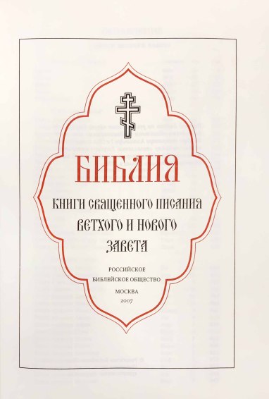 Перевод Библии на русский язык начат Российским Библейским обществом по Высочайшему повелению Государя императора Александра I в 1816 г., возобновлен по Высочайшему соизволению Государя императора Александра II в 1858 г., завершен и опубликован по благословению Святейшего Синода в 1876 г.