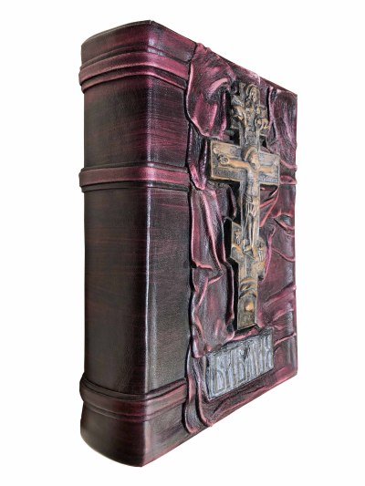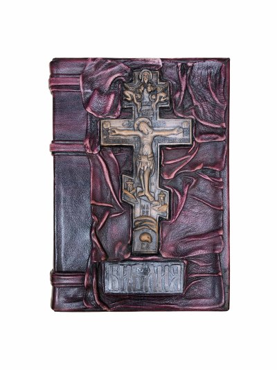 В цельнокожаном переплёте с эффектом мятой кожи. На обложке книги расположена накладка в виде креста. Серебряный обрез.